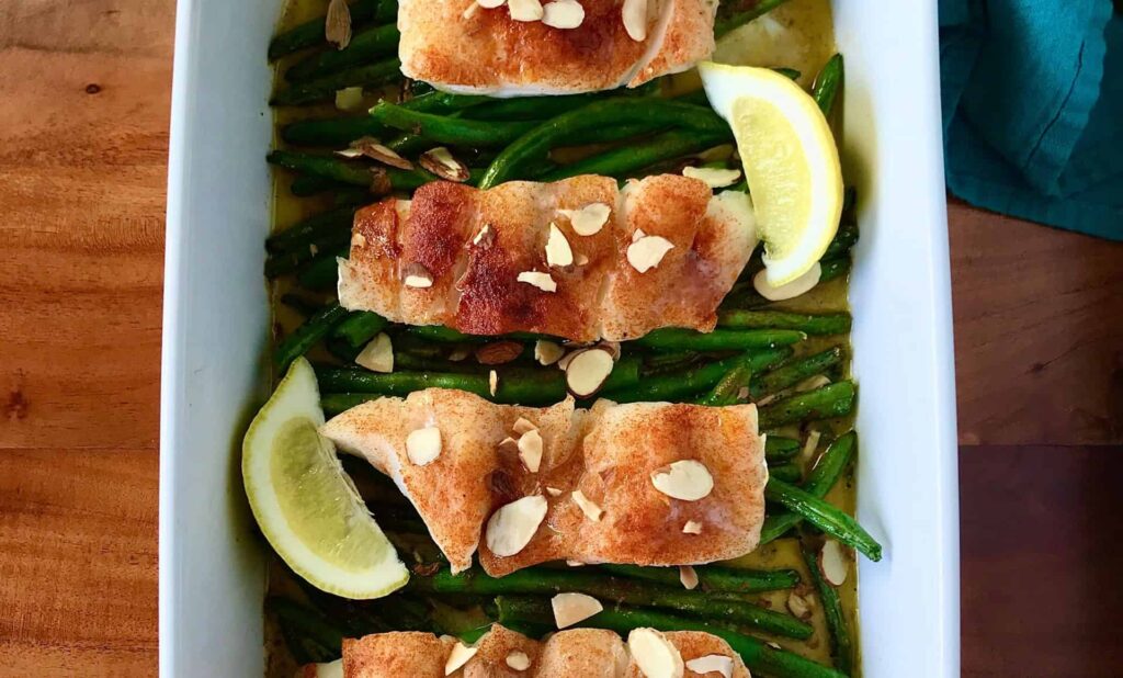 3. Spiced Butter Baked Cod with Almond-Topped Green Beans