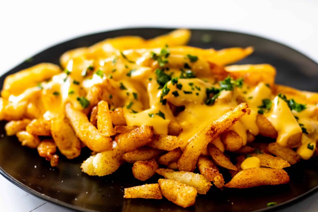 - Assemble and Serve: Pile hot fries on a platter, drizzle or dip with cheese sauce. Garnish with jalapeños or cilantro if desired.