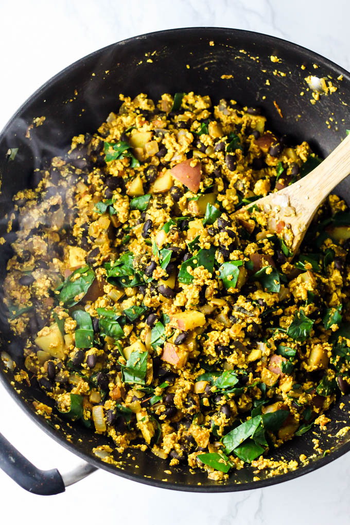 - Crumble tofu; add spices, cook 5 mins.