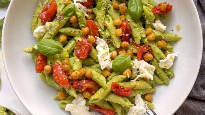 - Assemble and Sauce (5 minutes): Return drained pasta to the pot. Pour in the pesto sauce and reserved pasta water. Add sautéed veggies and chickpeas. Toss over low heat for 2 minutes until everything is coated in silky green goodness. If needed, splash more water for desired creaminess. Garnish with parsley and flakes.